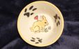 Small round Rabbit dish, Golden Wheat Rabbit, with heart and flower, and paw prints. Golden Wheat colour on the outside.Hand Painted. Dishwasher, Microwave, and Ovenproof.