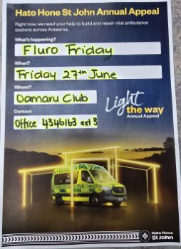 PROUD TO BE PARTICIPATING IN FLURO FRIDAY, COME ON OAMARU let's get behind St John Oamaru and build them a much-needed Station. All money raised here will stay in Oamaru for our station new build. We will at some stage need these fantastic people, whether it be for ourselves, family, friends or neighbours, so come down to the Club, 27th June and enjoy the fundraising festivities.
